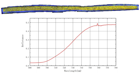 plants under sunlight. It has two peaks, one in the red light band(690 nm) and