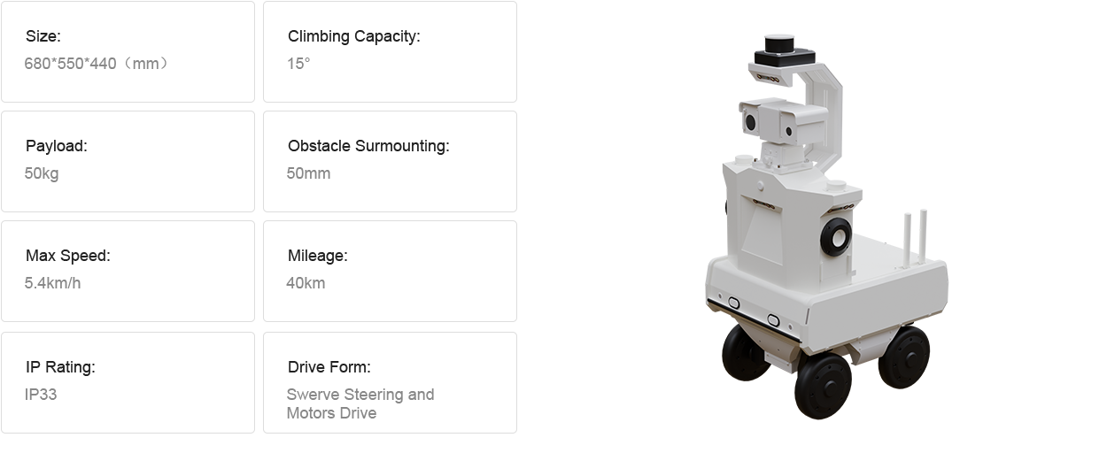 The RT-IR-WO4A01 Inspection Robot consists of a mobile chassis, navigation module, and vision system, and is primarily designed for automated inspection tasks in both indoor and outdoor environments. Featuring a four-wheel, four-drive (4WD/4WS) structure, the robot offers superior traversability and flexible mobility. It supports multiple movement modes including crab steering and zero-radius turning, ensuring smooth and reliable operation on common ground surfaces.